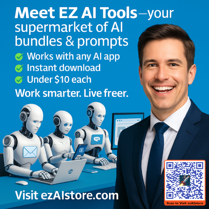 Whether you’re looking to automate repetitive tasks, boost your sales, organize your business projects, or simply make life easier, EZ AI Store has a bundle tailored to your needs. From business prompts to productivity boosters, website-building guides, and client-winning templates, every package is designed for real-world results.